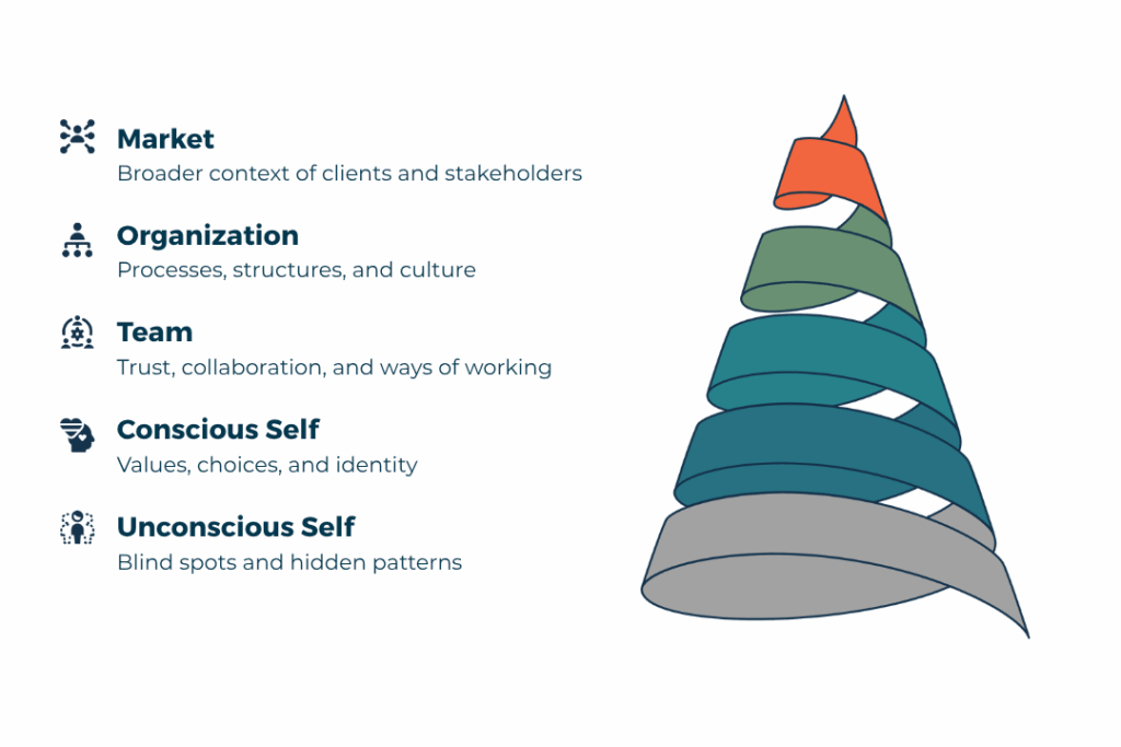 A purposeful and empowering leadership style. You gain clarity in your decision- making, embody influence and focus, while your team adopts more effective ways of working, and your organization becomes more strategically aligned with market challenges and opportunities.